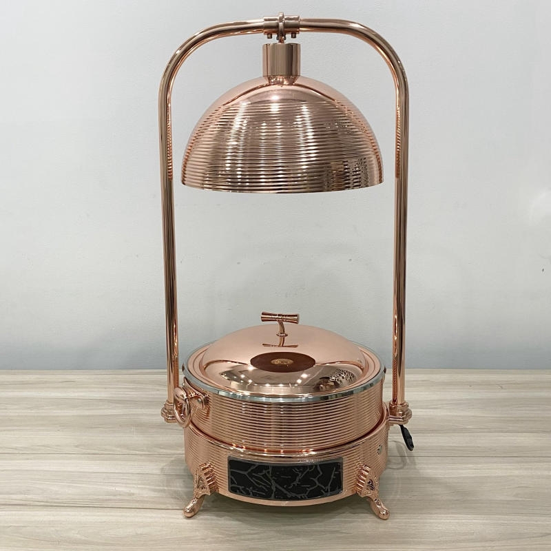 Sản phẩm kết hợp đèn hồng ngoại và nồi inox kèm nắp, giúp thức ăn giữ nhiệt lâu, an toàn và dễ vệ sinh, đồng thời tạo điểm nhấn sang trọng cho bàn buffet.